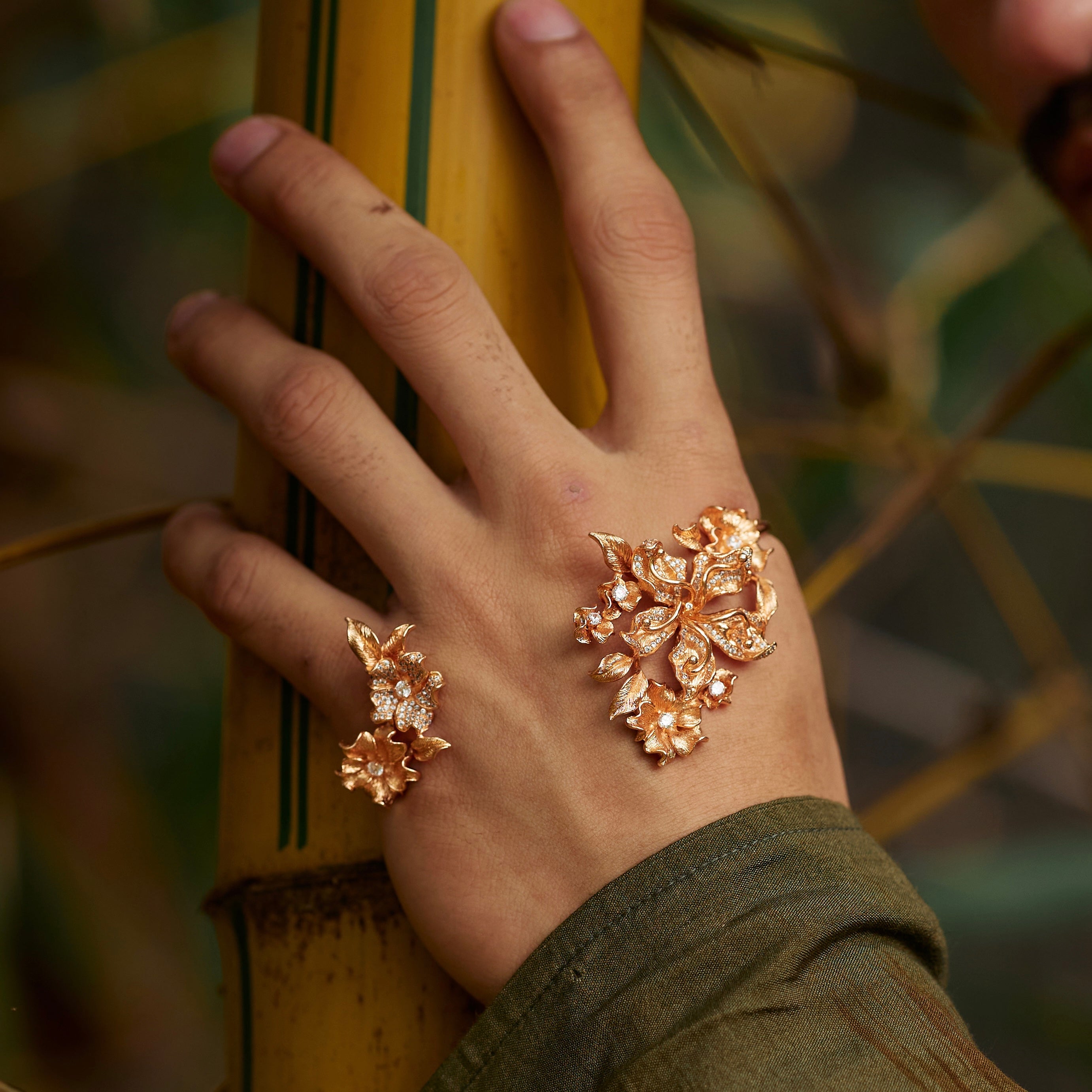 A sculptural bloom of handcrafted florals and leaves in 22k gold, designed to contour the palm with effortless elegance.